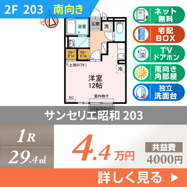 「浴室乾燥機」新設しました。安心のTVインターホン、室内物干し、宅配BOX、独立洗面台もあり一人暮らしには有難い設備がそろっています。お部屋は広い「12帖」の空間。単身用物件ですが、脱衣スペースもそろっています。国道55号線や末広大橋入口まで車で5分圏内。どこに行くにも便利な人気の「昭和町」エリアです。【立地】セブンイレブン徒歩4分|スーパー・キョーエイ徒歩6分|24時間スーパー・ハローズ徒歩13分|業務スーパー・Aプライス徒歩7分|ドラックストア・キリン堂まで徒歩7分|ホームセンター・DCM徒歩9分|。アパートのすぐ近くに南昭和町公園やセブンイレブンがあって便利です。歩いて6分の場所にドラッグコスモスもあります。昭和町七丁目交差点からも110mとお車での移動も便利です。ラーメンの久豊も2分程度にあります。サンセリエ昭和 105の基本情報