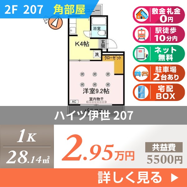 『6月30日までの契約開始で礼金、ハウスクリーニング費用、鍵交換代がオール0円キャンペーン実施中。』洋室の壁一面収納でお荷物の多い方もお片付けがラクラク。カードキー対応の電子ドアロックで防犯面も安心。都市ガス採用で光熱費がお得。ネットも無料で使えてこのお家賃はとってもリーズナブル。国道192号線や田宮街道まで徒歩圏内。ドラッグストアやコンビニも徒歩圏内でちょっとしたお買い物にも便利な立地です。スーパーのマルナカまで徒歩12分。ドラックストアmac徒歩8分。セブンイレブン徒歩8分。コインランドリー徒歩8分。国道192号線まで徒歩6分。田宮街道(県道30号線)まで徒歩8分。モニター付ドアホンで来訪者を確認できます。室内洗濯機置場で女性の方は特に安心ですね。RC造で遮音性も安心です。ハイツ伊世 302の基本情報