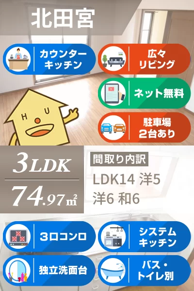 【インターネット無料】RC造マンション。エレベーター付き。人気の北田宮エリアの3LDKです。
