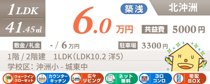 【ネット無料・ペット可・都市ガス】生活便利な沖浜エリアで大切なペットと暮らせる1LDK。