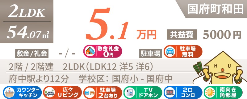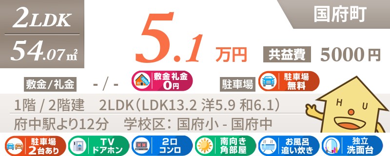 【駐車場1台無料・礼金0円】国府エリアの2LDK。南向きで日当たり良好!嬉しい角部屋です。