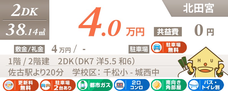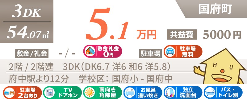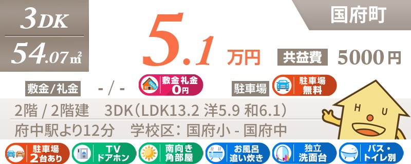 【インターネット無料】家賃、共益費、CATV、駐車場1台、水道代込で毎月たったの5.5万円の3LDK!
