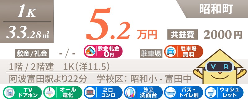 【徳島県庁徒歩圏内】昭和町の1Kマンション!都市ガス採用で光熱費がお得!お家賃とってもリーズナブル!