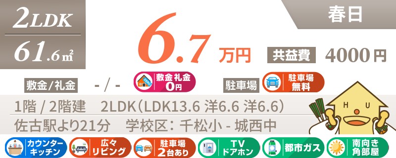 【ネット無料・礼金0円】イオンモール付近で今人気の末広エリア!駐車場1台契約必須となります。