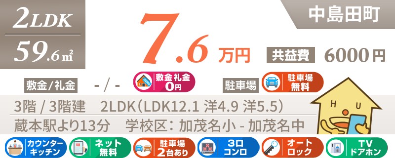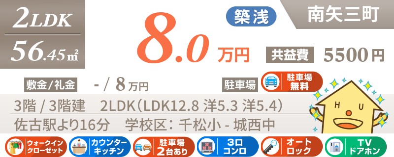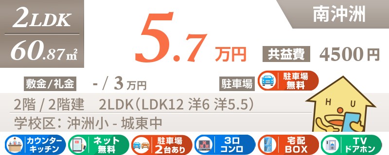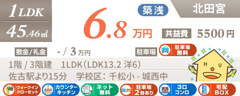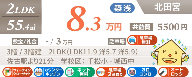 【インターネット無料】家賃、共益費、CATV、駐車場1台、水道代込で毎月たったの5.5万円の3LDK!