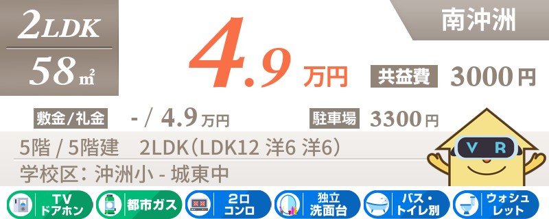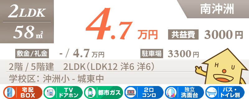 【駐車場1台無料】北沖洲のオートロック対応マンション!エアコン2台設置済みの最上階の2LDK♪