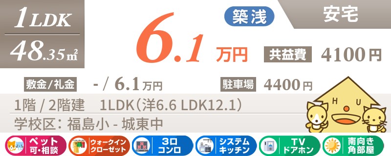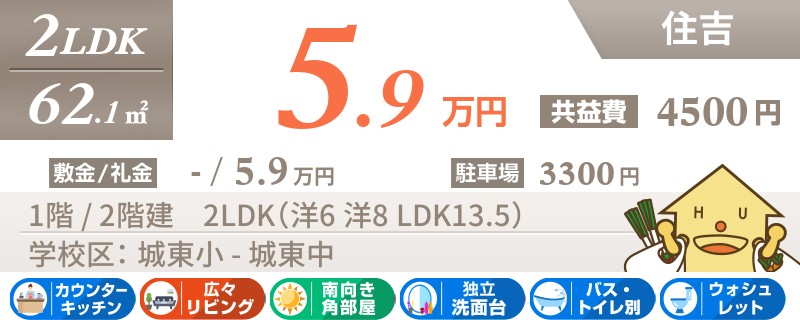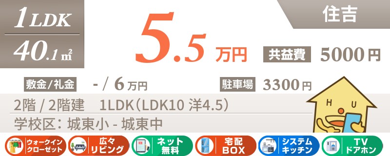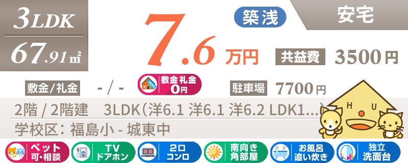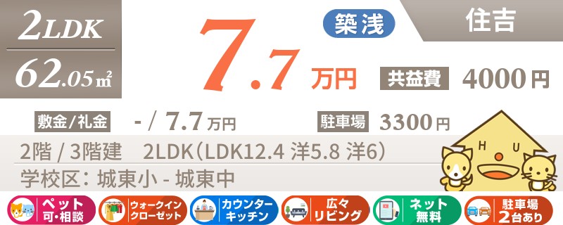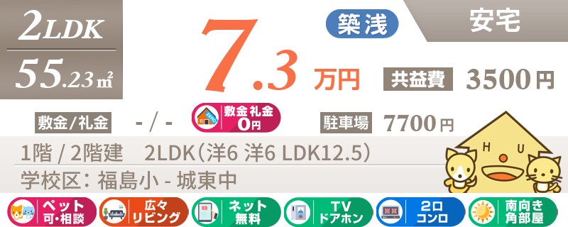 【インターネット無料】おしゃれにリフォーム済みの綺麗な2LDK★城東小学校まで徒歩約5分です!