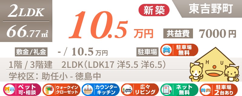 【ネット無料・エアコン2台付き・ペットOK】イオンモール徳島がある市内東部エリア★沖洲IC近く★