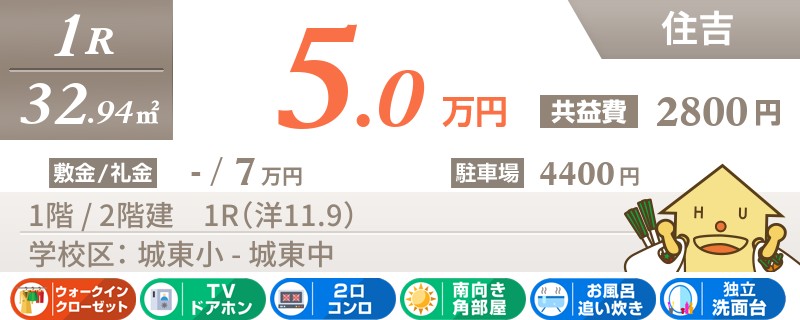 【角部屋・住吉エリア】築11年のキレイなワンルーム★コンビニ徒歩4分・スーパー徒歩1分の便利な立地★