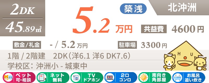 【北沖洲のペットと暮らせる2DK】ネット無料使い放題!エアコン2台設置済みで快適に過ごせます♪