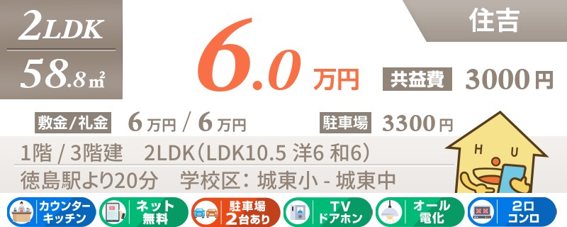 【インターネット無料のオール電化マンション】徳島駅まで自転車圏内の住吉エリアの2LDK!
