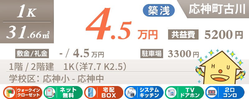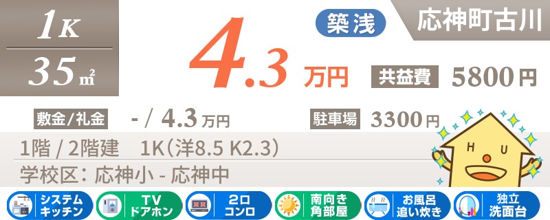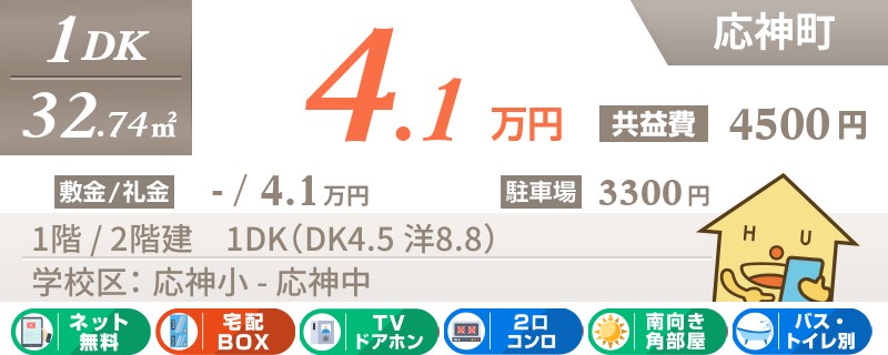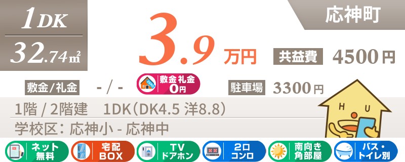 【インターネット無料使い放題】【敷金・礼金0円】応神町エリアの独立洗面台付き1K★