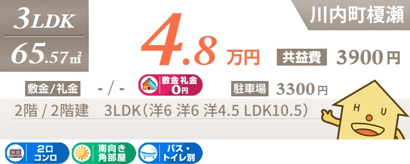 川内町榎瀬の南向きで最上階の3LDKアパート。