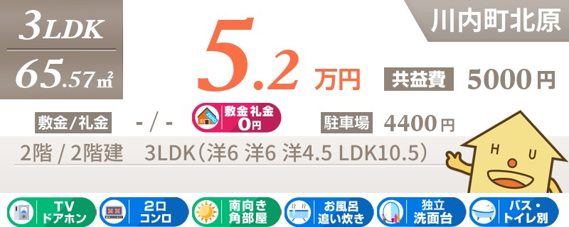 川内町北原の南向きで最上階の3LDKアパート。