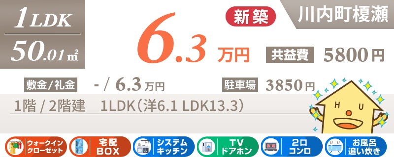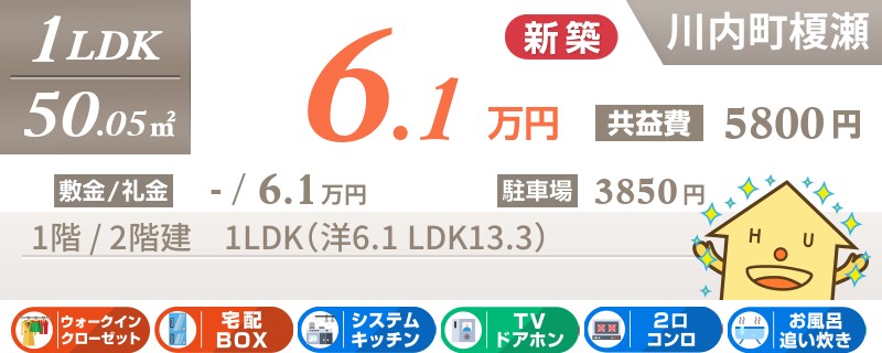 川内町榎瀬で宅配ボックスも嬉しい新築1LDKアパート。ウォークインクローゼット付きなのも人気の理由です。