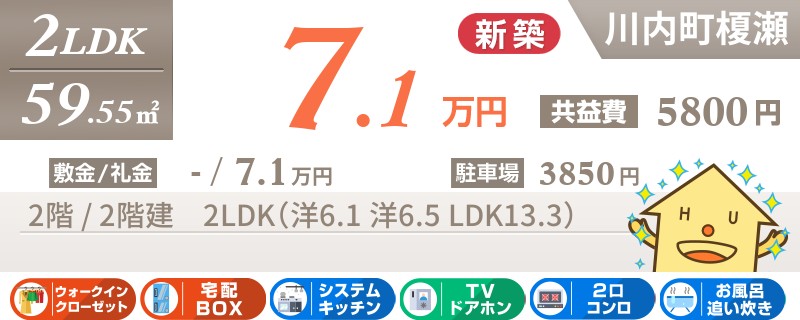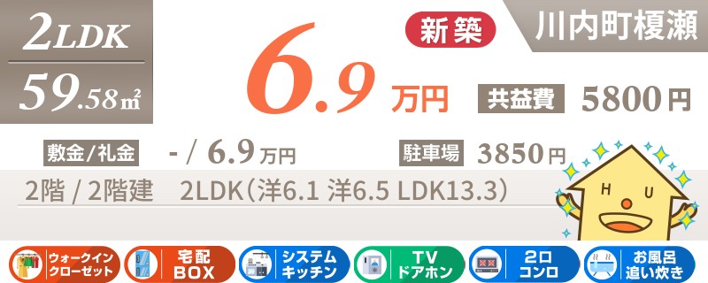 川内町榎瀬で宅配ボックスも嬉しい新築2LDKアパート。ウォークインクローゼット付きなのも人気の理由です。