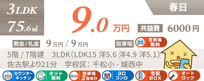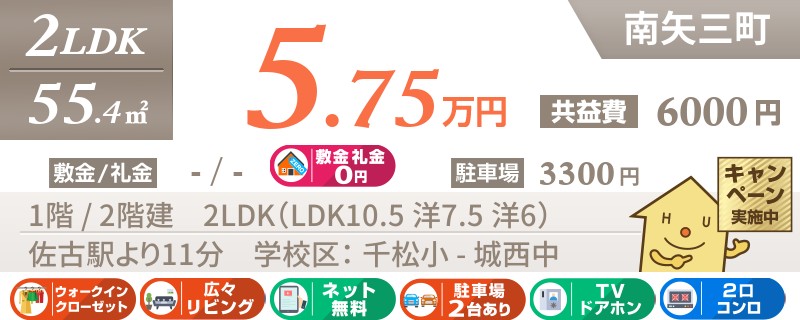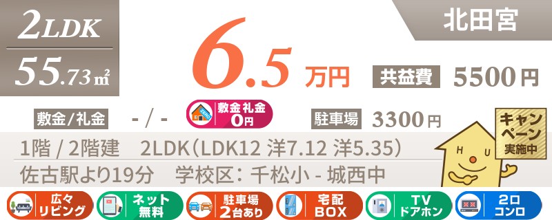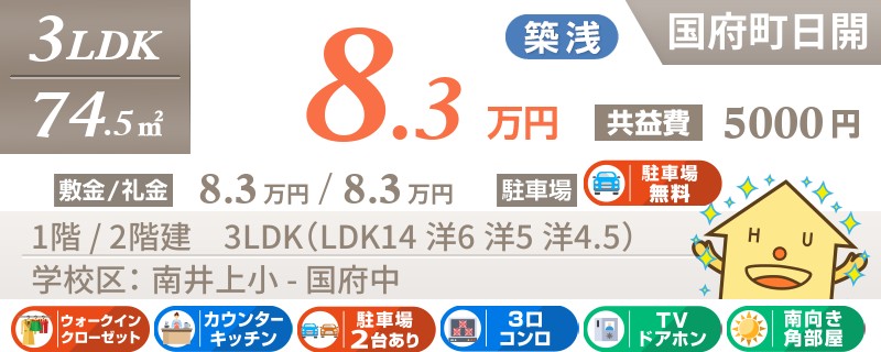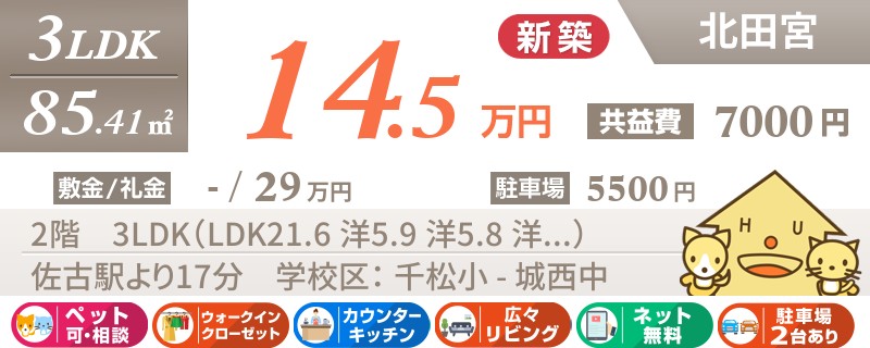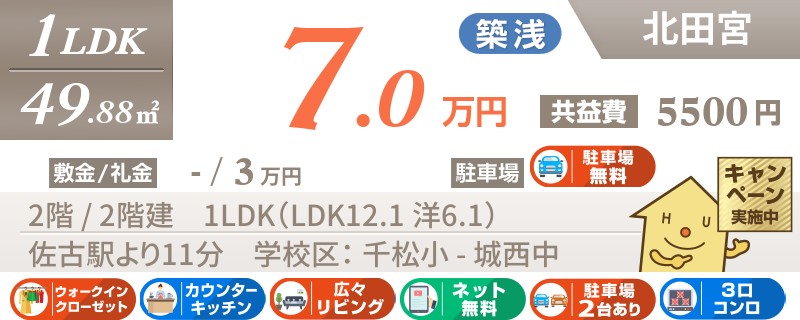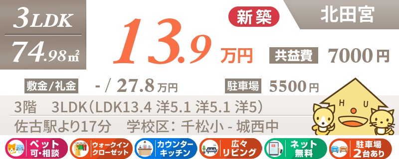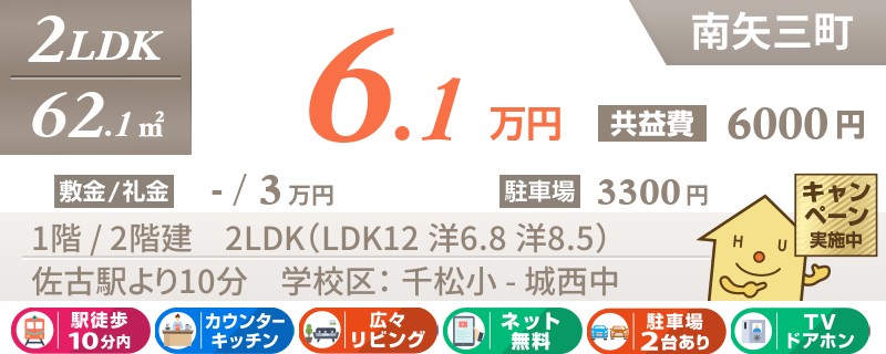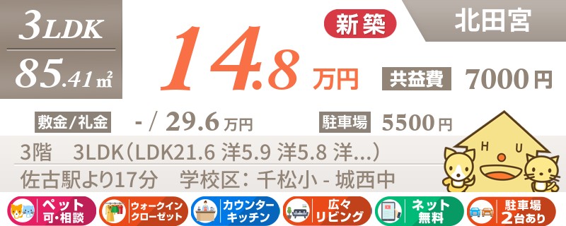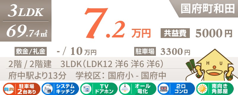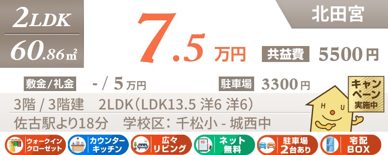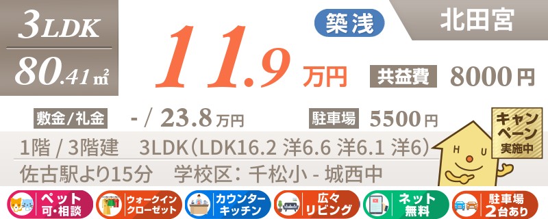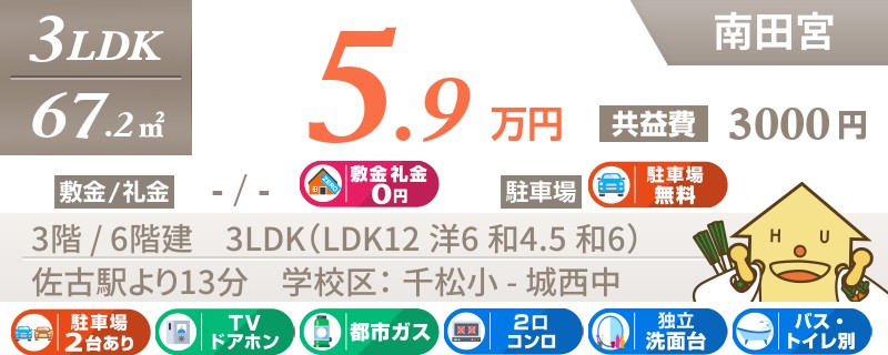 【インターネット無料】家賃、共益費、CATV、駐車場1台、水道代込で毎月たったの5.5万円の3LDK!