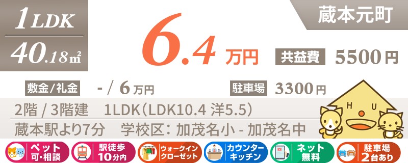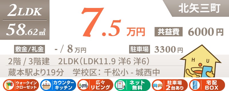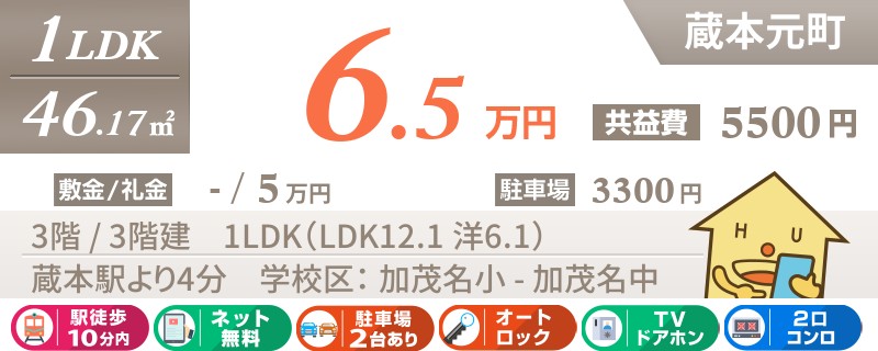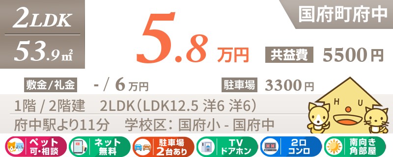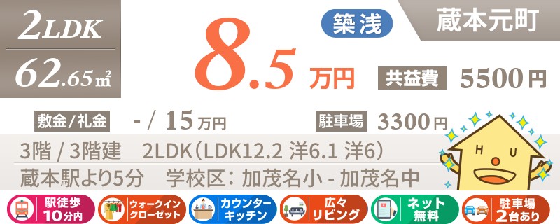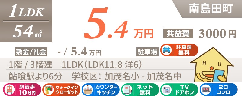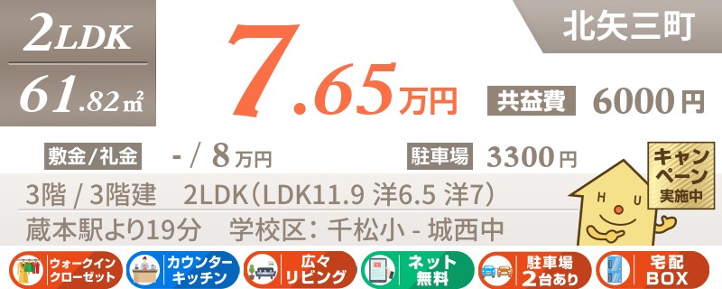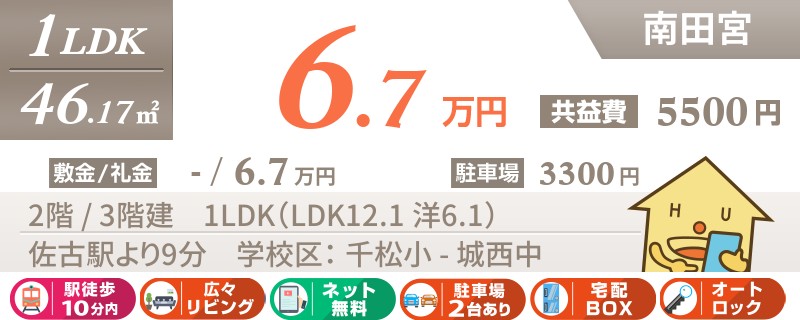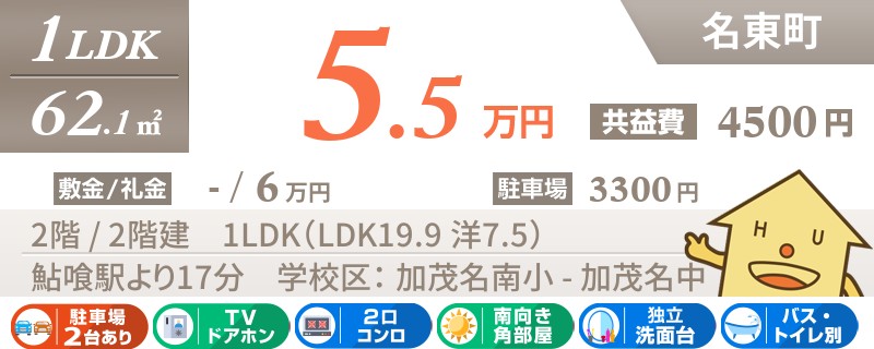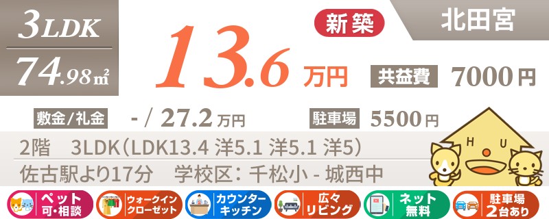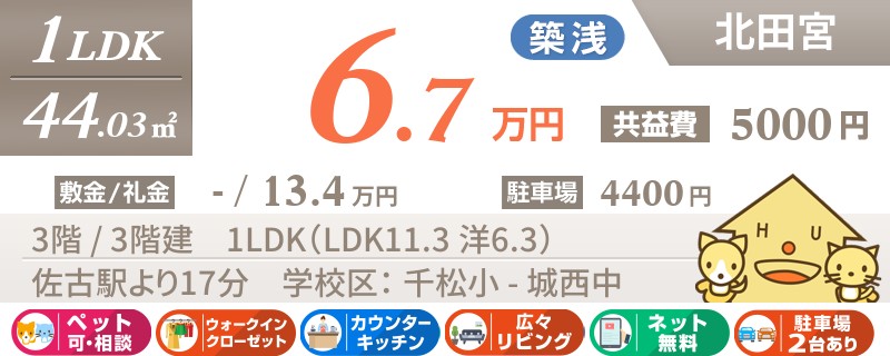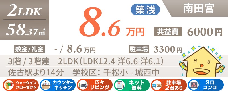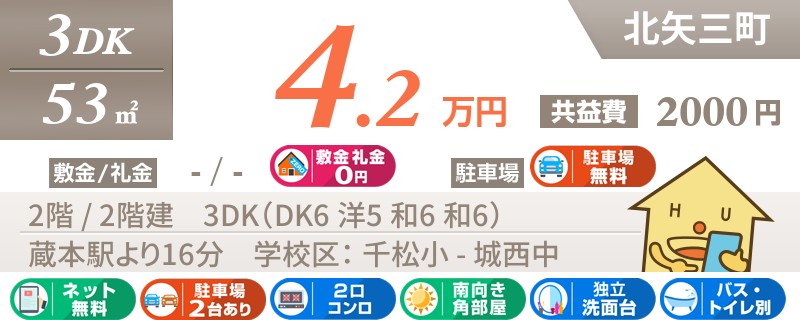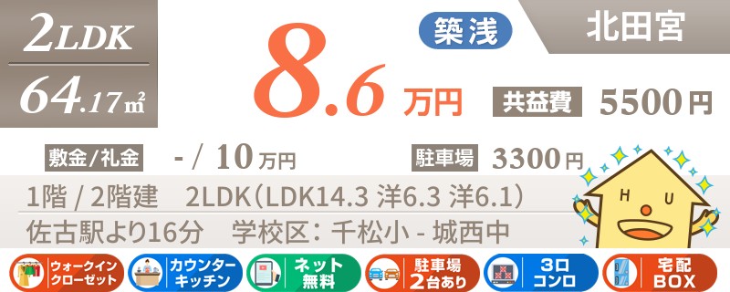【インターネット無料】家賃、共益費、CATV、駐車場1台、水道代込で毎月たったの5.5万円の3LDK!