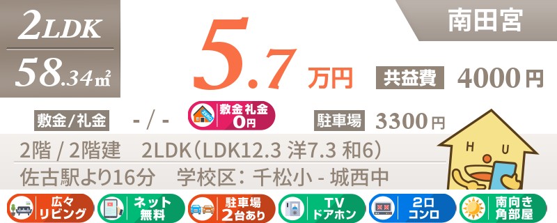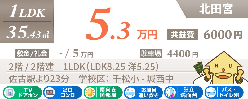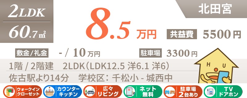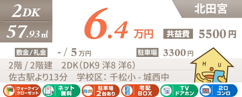 【インターネット無料・礼金0円】2階部屋!北田宮エリア!和室付きで小さなお子様がいる方に人気のお部屋。