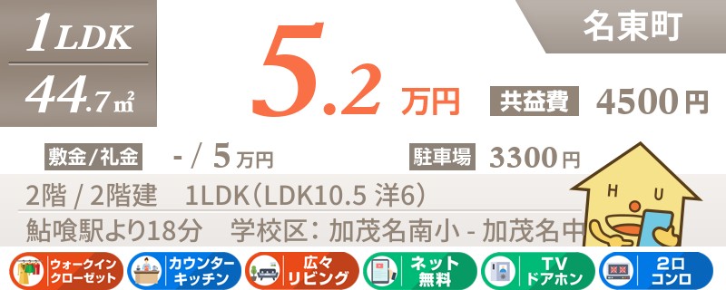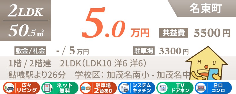 【ネット無料・2階・エアコン2台】名東町の主要道路にアクセス便利なお家賃リーズナブルな2LDK。