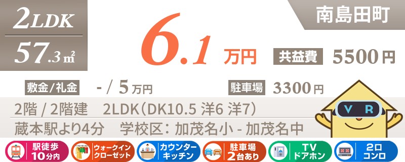 【2階角部屋・追い焚き機能・JR蔵本駅まで徒歩4分】主要道路にアクセス便利な南島田の2LDK。