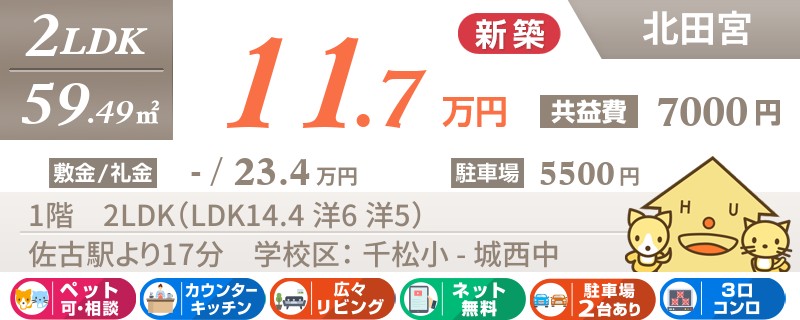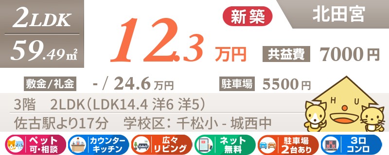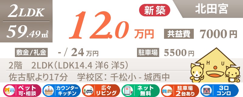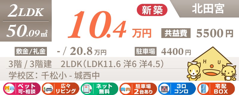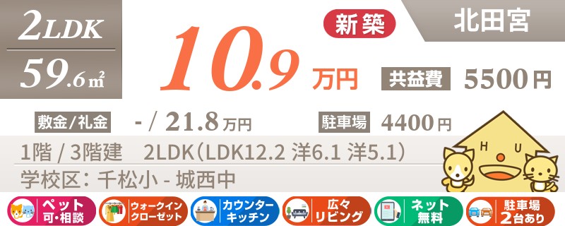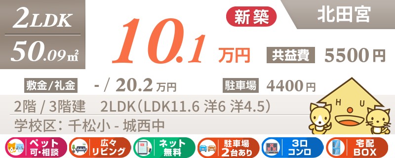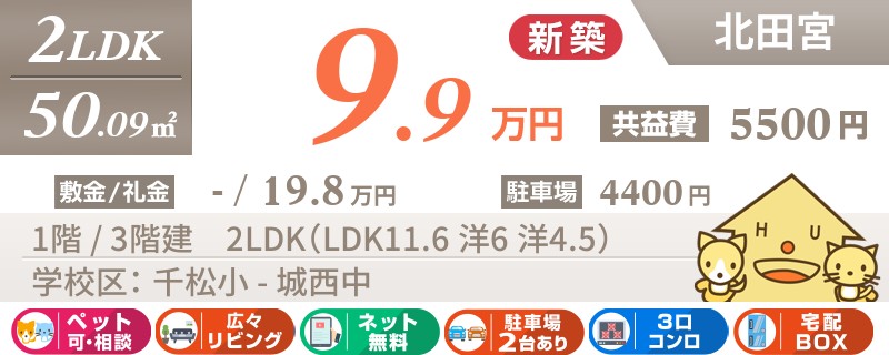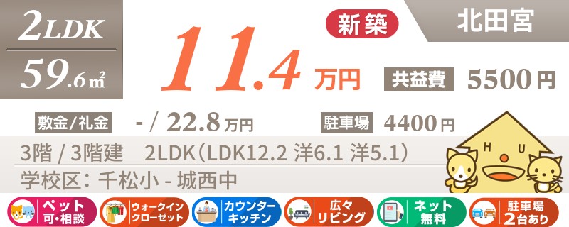 【ペットOK・全室エアコン・最上階角部屋】人気の北田宮エリアに高級仕様の2LDKが建設中です。