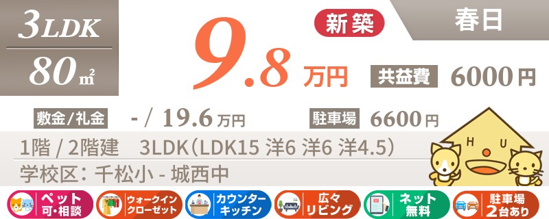 【新築戸建て3LDK・ネット無料・ペット飼育可】ファミリー様におススメな春日エリアの戸建て賃貸。