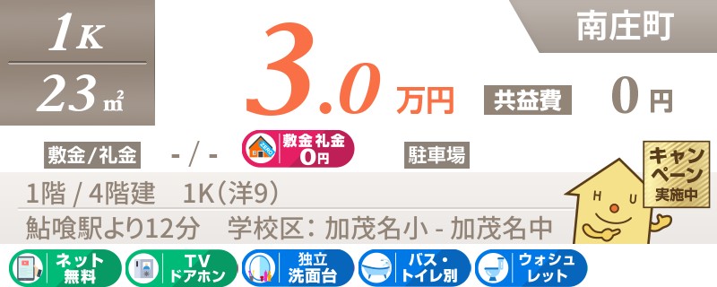 【ネット無料・室内リフォーム済み・1階角部屋】国道192号線にアクセスの良い庄町エリアの1Kタイプ♪