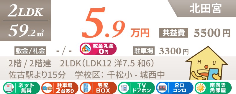 【2階角部屋・ネット無料・エアコン2台】最寄りのスーパー徒歩3分の北田宮にある2LDK。