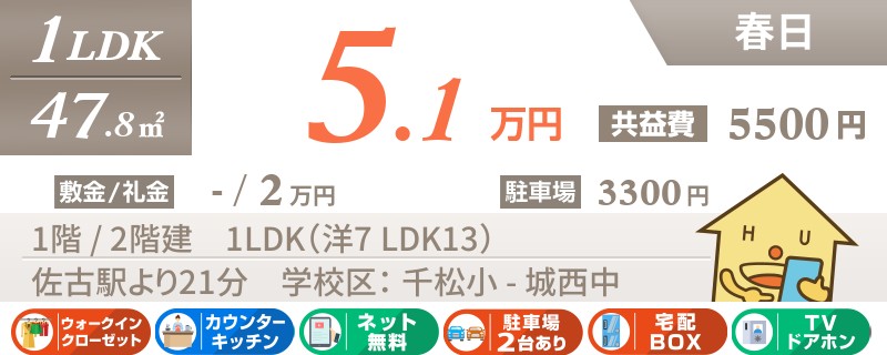 【駐車場1台無料・エアコン2台・都市ガス】人気の田宮街道にもアクセスのしやすい春日エリアの2LDK★