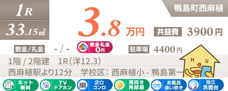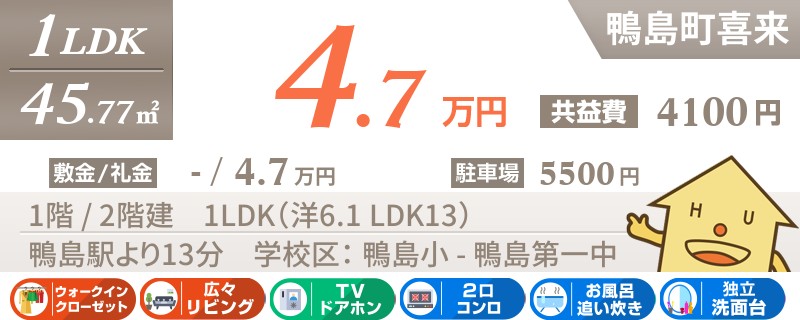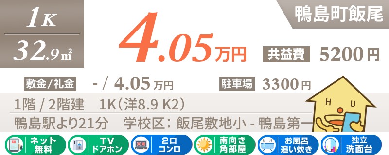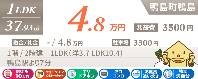 鴨島駅から徒歩13分の1LDKアパート。
