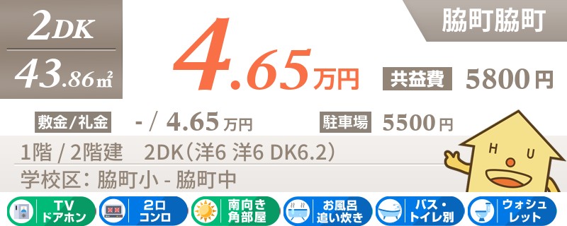 脇町字西赤谷エリアの南向きの2DKアパート。