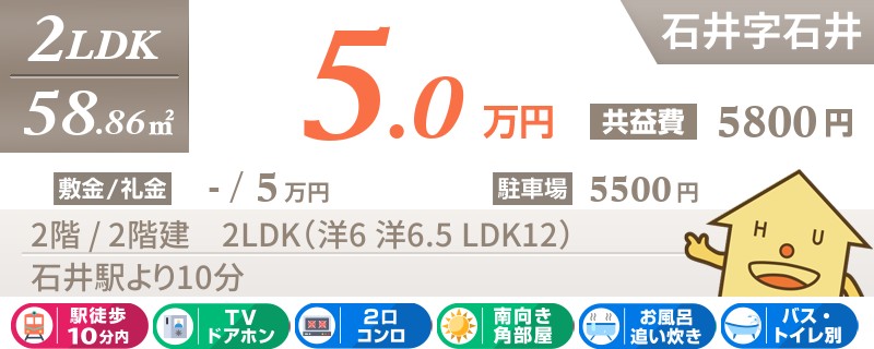 石井駅から徒歩13分の南向きで最上階の2LDKアパート。