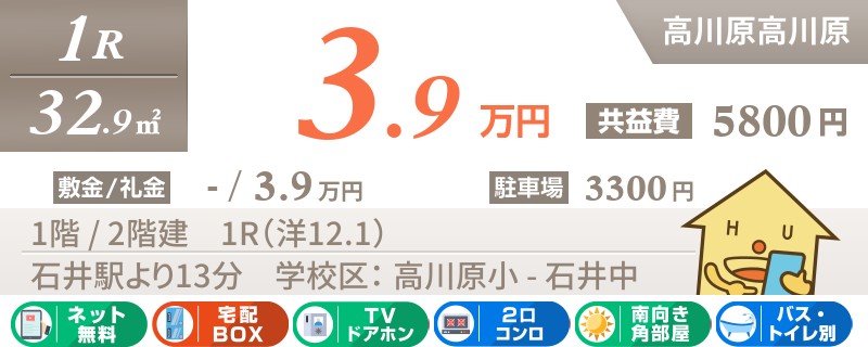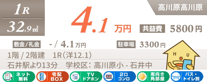 石井駅から徒歩13分の南向きで宅配ボックスも嬉しい1Rアパート。