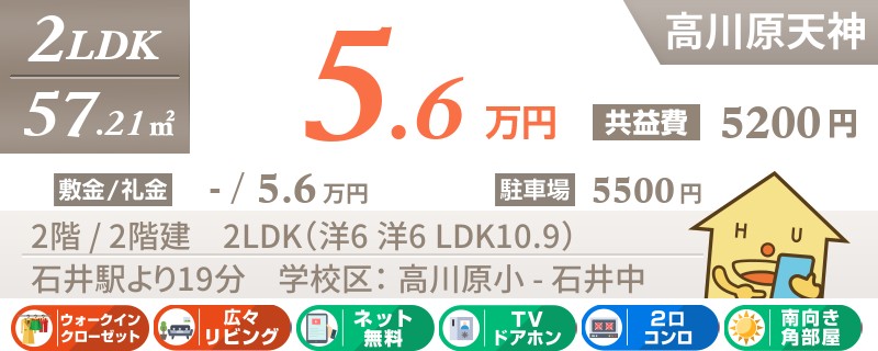 コンビニまで徒歩8分以内。石井駅から徒歩7分のネットも無料でペットと一緒に暮らせる2LDKアパート