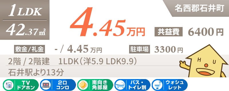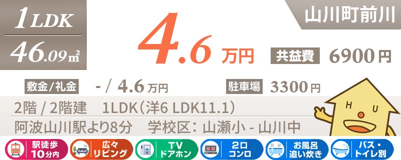 阿波山川駅から徒歩2分の南向きでペットと一緒に暮らせる1LDKアパート。