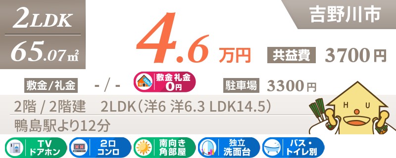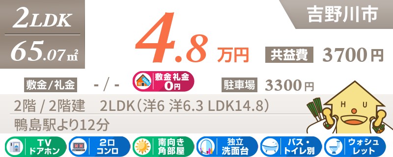 コンビニまで徒歩9分以内。吉野川市山川町八幡のネットも無料の2LDKアパート