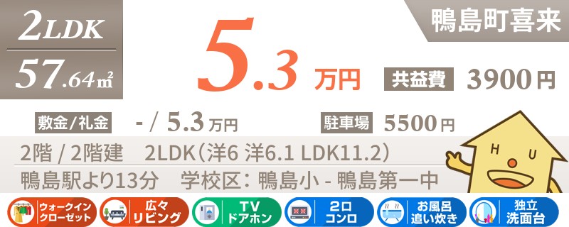 鴨島駅から徒歩11分で最上階の2LDKアパート。ウォークインクローゼット付きなのも人気の理由です。