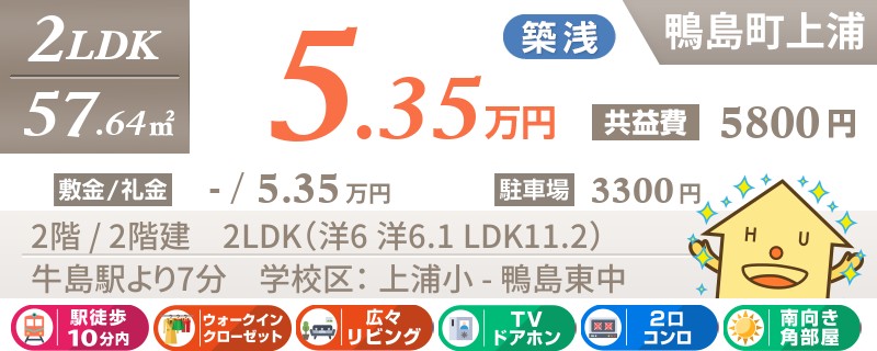 牛島駅から徒歩7分の南向きで最上階の築浅2LDKアパート。