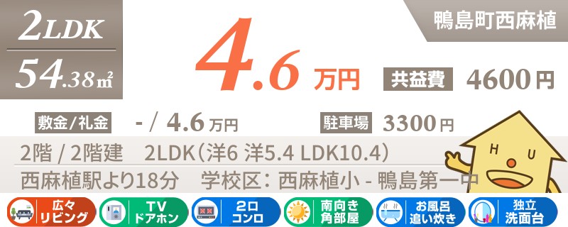 ラ・ムーまで歩いて6分の便利な立地です。鴨島駅から徒歩14分のネットも無料で安心のオートロック完備の2LDKアパート