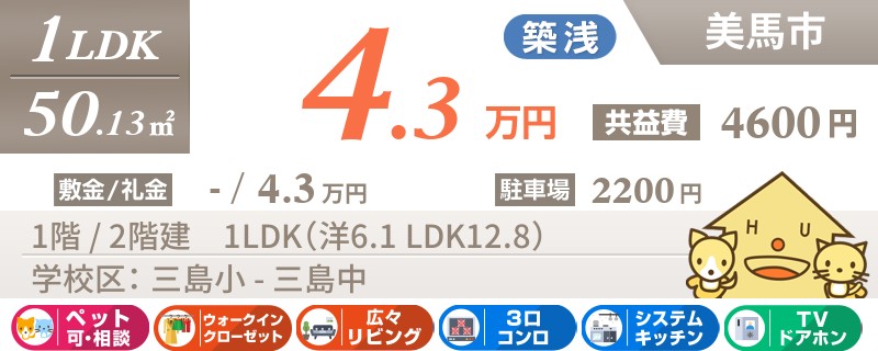 穴吹町三島字舞中島の南向きでペットと一緒に暮らせる築浅1LDKアパート。ウォークインクローゼット付きなのも人気の理由です。